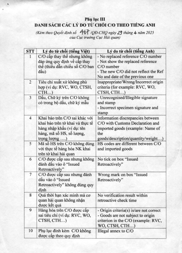 Phụ lục I và III, quyết định: 467/QĐ-CHQ V/v ban hành Quy trình kiểm tra, xác định xuất xứ hàng hóa xuất khẩu, nhập khẩu